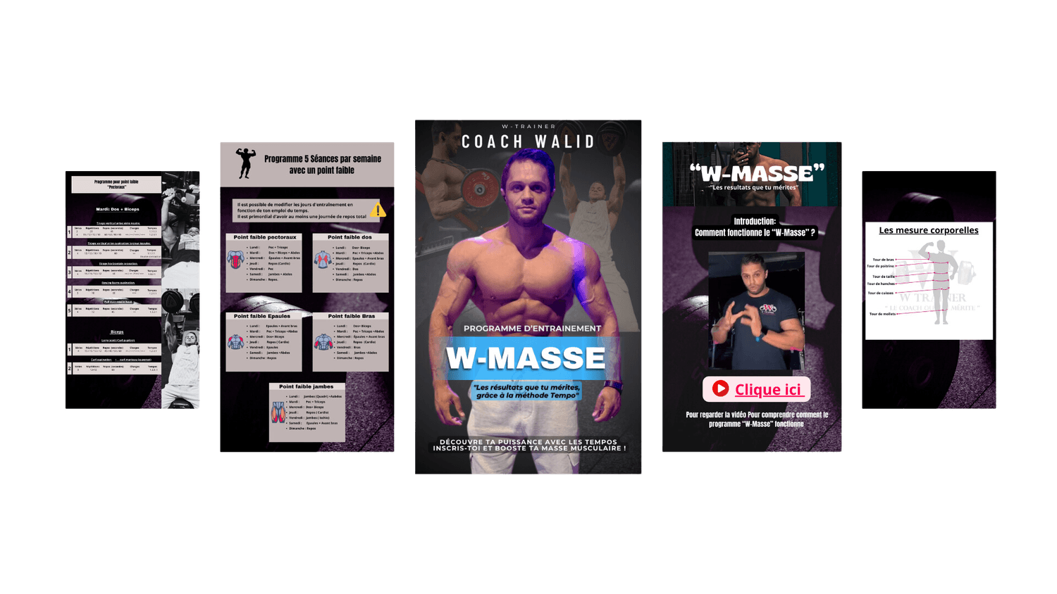 Investir dans le programme W-Masse, c'est choisir une méthode efficace pour enfin prendre de la masse musculaire. Si tu galères à obtenir des résultats malgré tes efforts à la salle, W-Masse t'offre des séances adaptées à ton rythme, avec des techniques d'intensification conçues pour maximiser ta progression. Plus de temps perdu : tu as un plan clair et structuré pour atteindre tes objectifs. C'est l'opportunité idéale pour transformer tes efforts en résultats concrets.