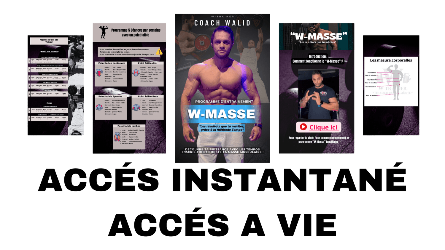 W-Masse te guide pas à pas, avec des vidéos explicatives pour chaque exercice, afin que tu saches exactement quoi faire à la salle, sans te sentir perdu.